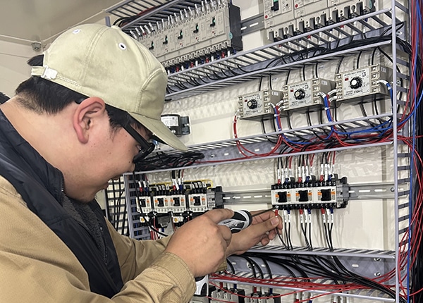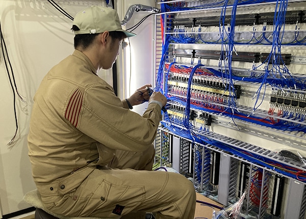 主力となる制御盤の設計・製作は、数多くの業界で高い評価を受け、それで培った電気技術をコアに、テクノロジーネットワークを駆使して工作機械、産業用ロボットなどを生み出し、ハードウエア・ソフトウエアのトータルマネジメントも行っています。独自の技術を、ハード面・ソフト面どちらにも活かした高い総合力が、海外向けの設計・製作の実績につながっています。
